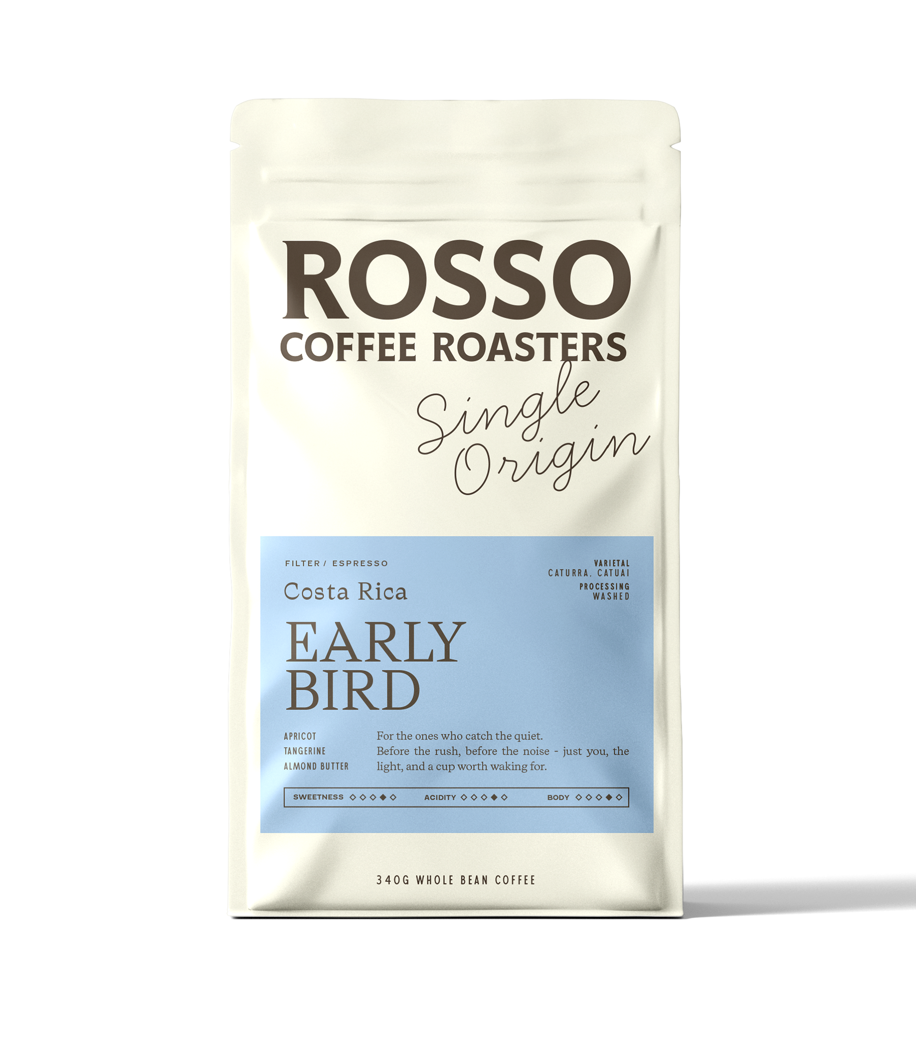 Early Bird greets you with the soft glow of an early morning. Apricot sweetness rising first, bright tangerine following like sun catching the treetops. A velvety almond-butter richness settles in the finish, comforting and calm, the kind of cup that makes dawn feel like a reward.